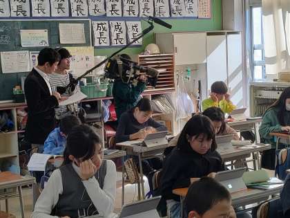 11月22日【5年生】教室にテレビカメラが!! 公開日 2024/11/22 更新日 2024/11/22 校長日記 この模様は 12月4日(水)NHK ニュースーン 17:30分ごろの特集で取り上げられ、放映される予定です。 タブレットを使ってデジタルの教科書を使って!!! 今の小学校はこんなのですか!!?? 撮影クルーの方々も大きな変化にびっくりの様子でした!!