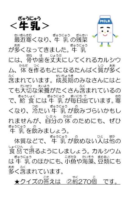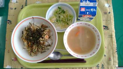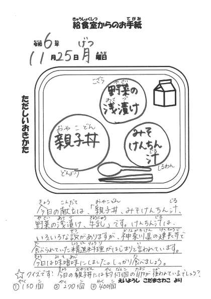 【今日の献立】 ・親子丼 ・みそけんちん汁 ・野菜の浅漬け ・牛乳