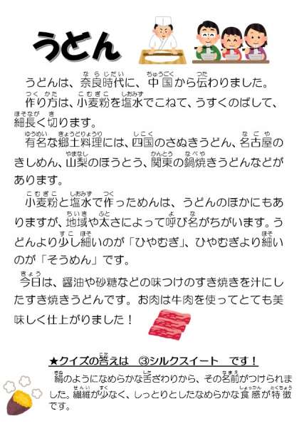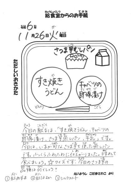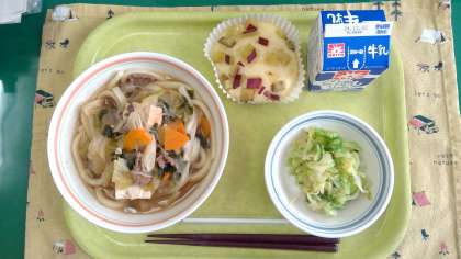 【今日の献立】 ・すき焼きうどん ・キャベツの即席漬け ・さつま芋蒸しパン ・牛乳