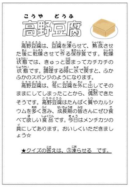 【今日の献立】11月29日(金) 公開日 2024/11/29 更新日 2024/11/29 今日の献立 【今日の献立】 ・ごはん ・大根と油揚げのみそ汁 ・高野豆腐のメンチカツ ・野菜のおろし和え ・牛乳