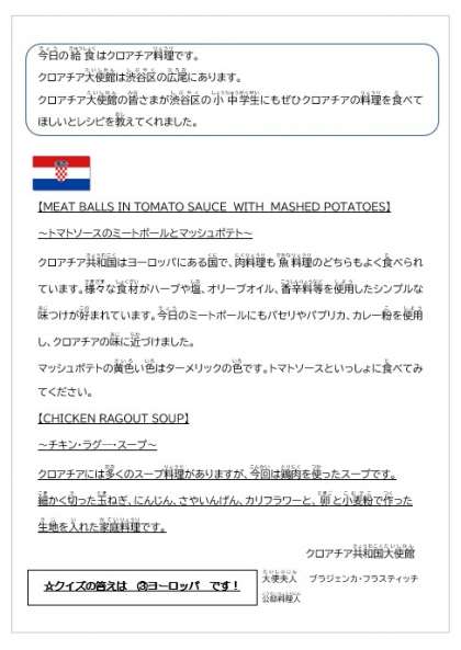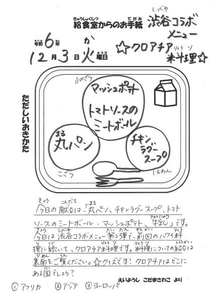 【今日の献立】〜渋谷コラボメニュークロアチア料理〜 公開日 2024/12/03 更新日 2024/12/03 今日の献立 【今日の献立】 ・丸パン ・チキンラグースープ ・ミートボールのトマトソース ・マッシュポテト ・牛乳
