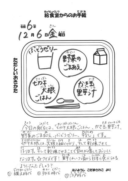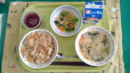 【今日の献立】 ・切干大根ごはん ・かき玉里芋汁 ・野菜のごま和え ・ぶどうゼリー ・牛乳