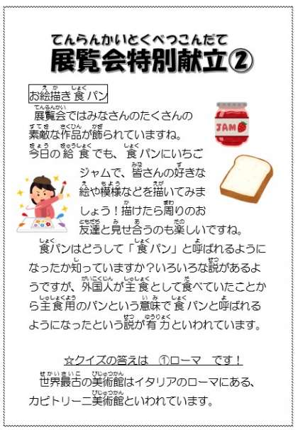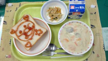 【今日の献立】12月13日(金)〜展覧会特別献立〜 公開日 2024/12/13 更新日 2024/12/13 今日の献立 【今日の献立】 ・お絵描き食パン(いちごジャム) ・お豆と根菜のクリームシチュー ・ツナサラダ ・牛乳
