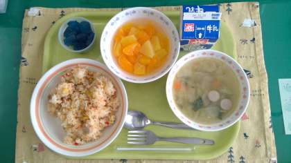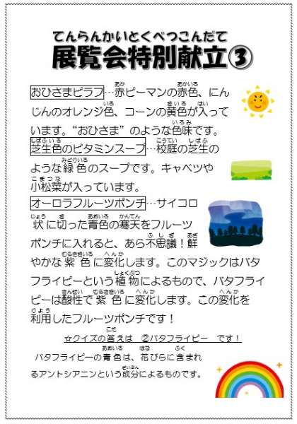 【今日の献立】12月14日(土)〜展覧会特別献立 レインボー給食〜 公開日 2024/12/14 更新日 2024/12/14 今日の献立 【今日の献立】 ・おひさまピラフ ・芝生色のビタミンスープ ・オーロラフルーツポンチ ・牛乳