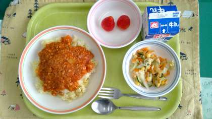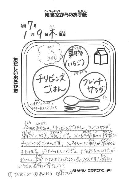 【今日の献立】 ・チリビーンズごはん ・フレンチサラダ ・果物(いちご) ・牛乳