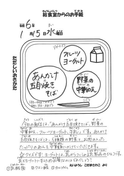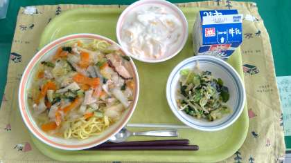 【今日の献立】 ・あんかけ五目焼きそば ・野菜の中華和え ・フルーツヨーグルト ・牛乳