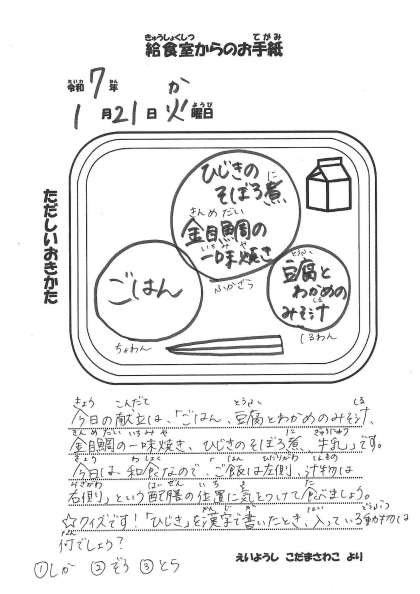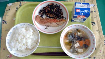 【今日の献立】 ・ごはん ・豆腐とわかめの味噌汁 ・金目鯛の一味焼き ・ひしきのそぼろ煮 ・牛乳