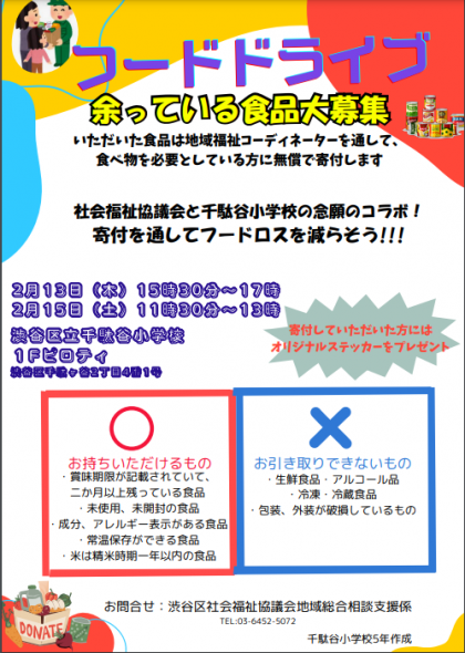 2月14日【シブヤ未来科】【5年生】【協力依頼】土曜日 フードドライブやります!! 公開日 2025/02/14 更新日 2025/02/14 校長日記 明日の学校公開時 ご来校の際に ぜひ ご協力よろしくお願いします
