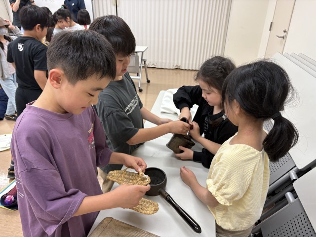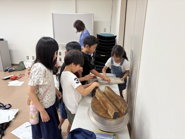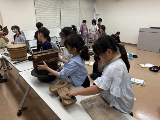 最後の訪問地は郷土博物館でした。昔の道具を触ってみました。