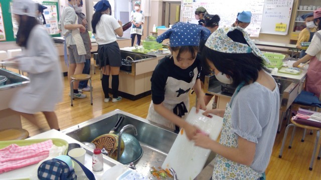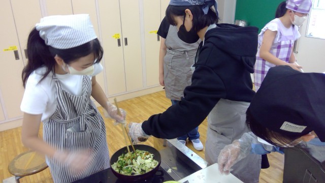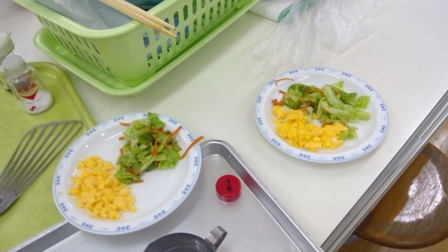 炒めて、盛り付けて、洗い物も同時進行。