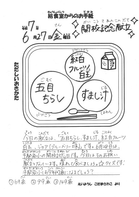 【今日の献立】6月27日(金)~開校記念献立~ 公開日 2025/06/27 更新日 2025/06/27 今日の献立 【今日の献立】・五目ちらし・すまし汁・紅白フルーツ白玉・ジョア(ブルーベリー) 給食