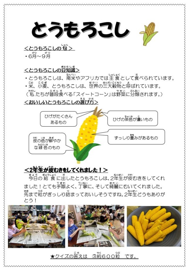 【今日の献立】7月8日(火)~2年生とうもろこしの皮むき体験~ 公開日 2025/07/08 更新日 2025/07/08 今日の献立 【今日の献立】・チンジャオロース丼・もずくと玉子のスープ・蒸しとうもろこし・牛乳 給食