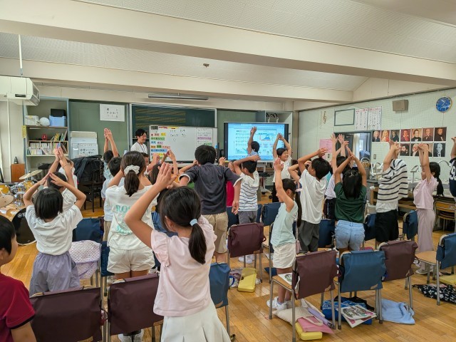 曲の盛り上がる所を子供達はよく理解して歌っていました。身体表現を入れながら楽しく歌いました。さいごは、楽しいゲームをして一時間の学習が終了です。