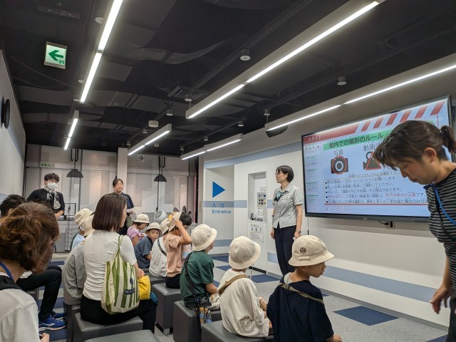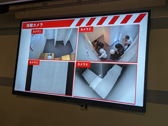 煙体験では、数名のグループで体験し、外ではモニターで避難している様子を見ることができます。