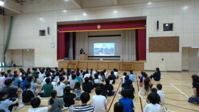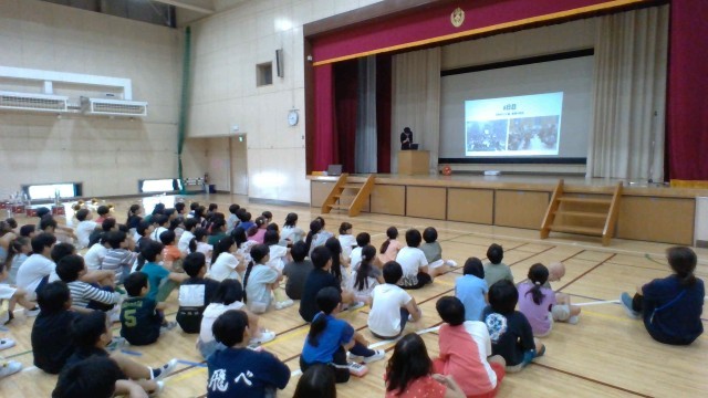 9月21日、児童朝会では、「あいさつ」の話と「フィンランド派遣の報告会」を行いました。