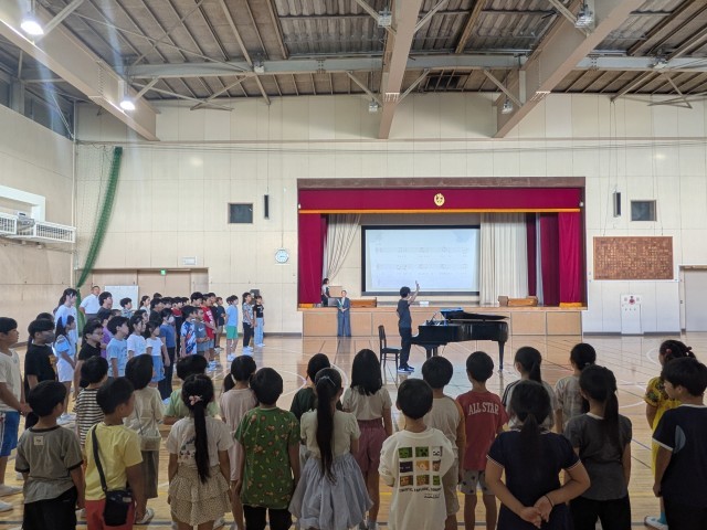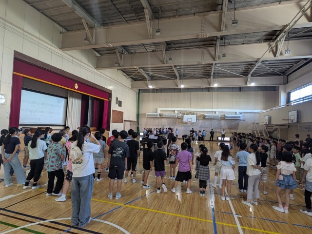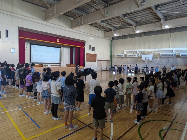 今日は音楽朝会です。 全体で集まって歌を歌ったり、音楽を聴いたりします。