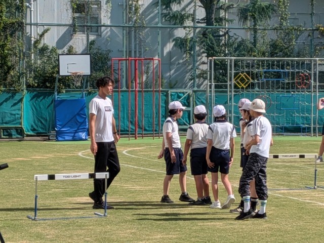 今日はアスリートの方が6年生に陸上の勉強を教えに来てくれました。走り高跳び、走り幅跳び、マラソンのアスリートの方々です。