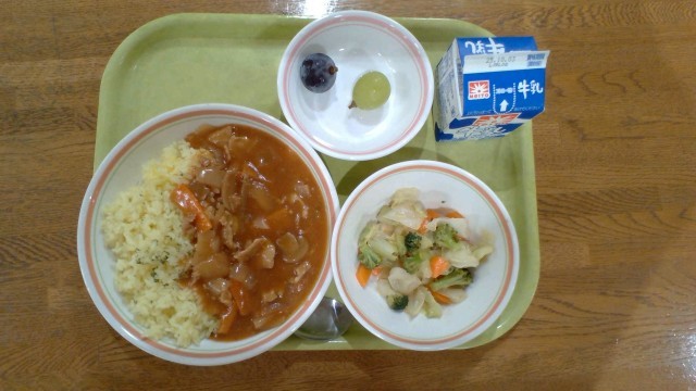 給食だより 9月26日(金) 公開日 2025/10/01 更新日 2025/10/01 今日の給食 今日の献立・ハヤシライス・牛乳・レモンドレッシングサラダ・食べ比べぶどう(シャインマスカット・ピオーネ)★今日は、「ぶどうの種類」について、食育メモでクラスにお知らせをしました。