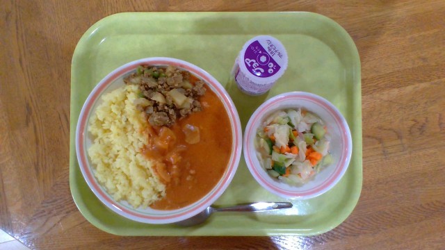 給食だより 10月20日(月) 公開日 2025/10/20 更新日 2025/10/20 今日の給食 今日の献立・バターチキンカレー・発酵乳(ブルーベリー)・サブジ・コールスロー★今日は、発酵乳とカレーの関係について、食育メモでクラスにお知らせをしました。