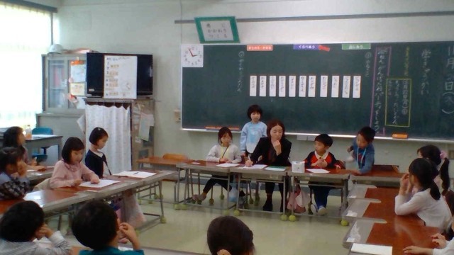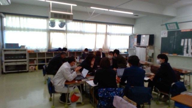 児童下校後、教員が集まって、今日の授業について協議を行いました。