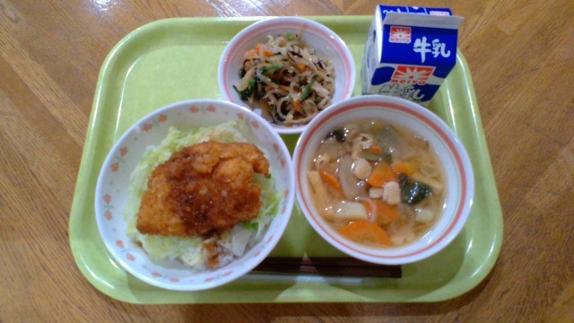 11月28日(金) 公開日 2025/11/28 更新日 2025/11/28 今日の給食 今日の献立・チキンソースカツどん・牛乳・ひじきのナムル・打ち豆汁★今日は、汁物に使った昔から伝わる保存食の「打ち豆」について、食育メモでクラスにお知らせをしました。