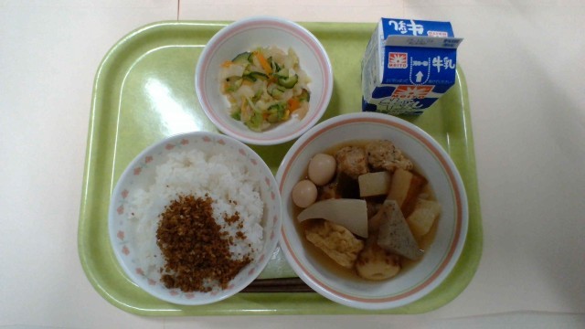 給食だより 12月3日(水) 公開日 2025/12/05 更新日 2025/12/05 今日の給食 今日の献立・ごはん・牛乳・おかかふりかけ・おでん・白菜の沢庵和え★今日は、これから寒くなる季節にぴったりの「おでん」について、食育メモでクラスにお知らせをしました。