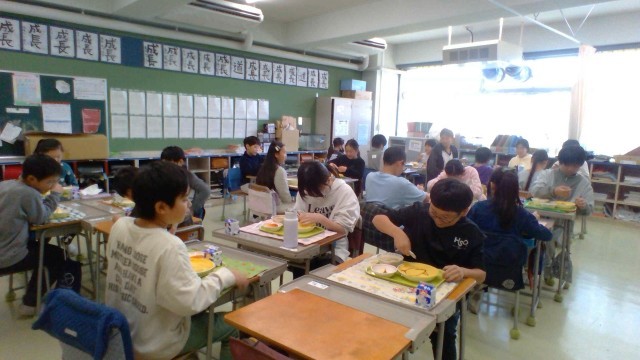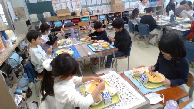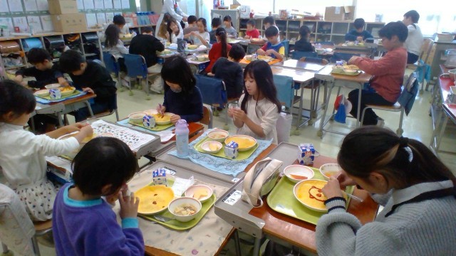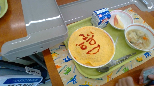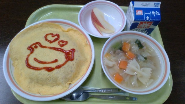 それを記念して、今日の給食は、展覧会コラボ献立はともりふうおえかきオムライスでした。
