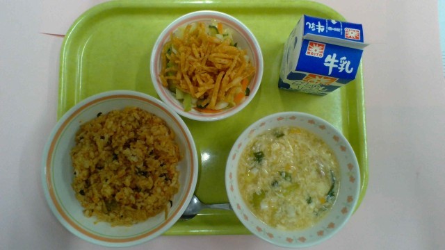 今日の献立 12月15日(月) 公開日 2025/12/15 更新日 2025/12/15 今日の給食 今日の献立・ビビンバチャーハン・牛乳・中華コーンスープ・バリバリサラダ★今日は、ビビンバチャーハンの特徴を、食育メモでクラスにお知らせをしました。