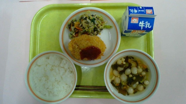 給食だより 12月18日(木) 公開日 2025/12/18 更新日 2025/12/18 今日の給食 今日の献立・ごはん・牛乳・お豆とコーンのコロッケ・海苔のサラダ・ふぶき汁★今日は、いんげん豆のペーストを使ってコロッケを作りました。外はカリッと揚がり、子どもたちに大人気のコロッケになりました。毎日クラスに配る食育メモには、ふぶき汁の特徴をお知らせしました。