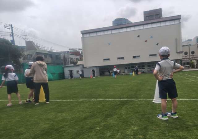 スポーツフェスティバルに向けて みんなで「よーいドン」。まっすぐ ゴールまで走り切る練習をしています。