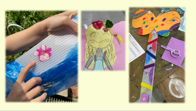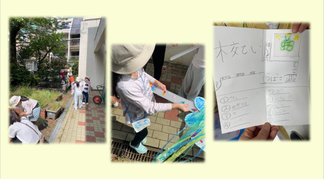 まずは一緒に、おさんぽに行く「あいぼう」を色や形を考えたり、クレヨンの使い方、飾り付けを工夫しながら誕生させました。お散歩では、メモ帳に見つけた春のことをメモしたり、桜の花びらを拾って「あいぼう」にテープでつけたりしながら活動しました。
