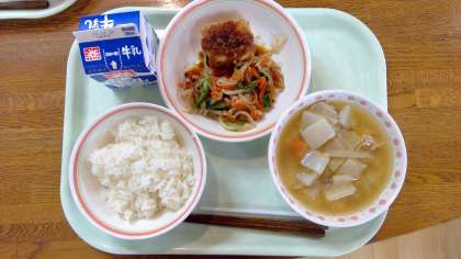 揚げ豆腐は厚揚げのように見えますが、豆腐をそのまま素揚げする厚揚げと異なり、かたくり粉や小麦粉をまぶして揚げたものです。配膳の時から「揚げ豆腐美味しそう。」という声が聞こえました。たんぱく質やカルシウムなどの栄養素がたくさん含まれる豆腐は、成長期の子供たちにしっかり食べてもらいたい食品です。