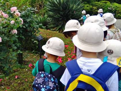 園内をぐるっと探検した後は、整形式庭園のバラ園にて、たてわり班のグループに分かれて「ミッション」に挑戦しました。「3文字の名前のバラを探せ!」「白いバラをさがせ!」など、グループごとに異なるミッションに協力して取り組みました。