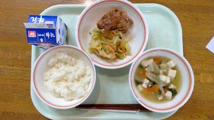 今日は3年生からのリクエスト給食で、主菜部門から選ばれた鶏の唐揚げです。鳩森小では、唐揚げが大人気で、リクエスト給食の定番になっています。給食の唐揚げは朝からしょうが、にんにく、しょうゆの漬けだれにつけているので、よく味が染みていて好評です。
