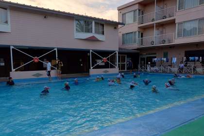 今年の4年生は「七滝」ハイキングからスタートです。「滝」という漢字を書いて、「たる」と読みます。不思議ですね。理由を知りたい人は4年生に聞いてみてください。「七滝」には七つの滝があるのですが、ガイドさんと一緒に、そのうちの五つの滝を見ました。虹も見られました。1時間半近く、ハイキングをしましたが4年生はとっても元気で、宿に着いてからは、プールで遊びました。