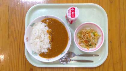 キーマカレーの「キーマ」は、ヒンディー語やウルドゥー語で「細かいもの」という意味があります。日本では、ひき肉を使うことが多いです。きょうは、玉ねぎをよく炒めて甘みを出してひき肉で作ったキーマカレーを献立に取り入れました。おいしく食べてください
