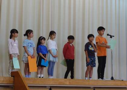 プール開きでは、それぞれの学級の代表児童が、今年度のプールでの学習で頑張りたいことを発表しました。どの子も堂々と発表することができました。