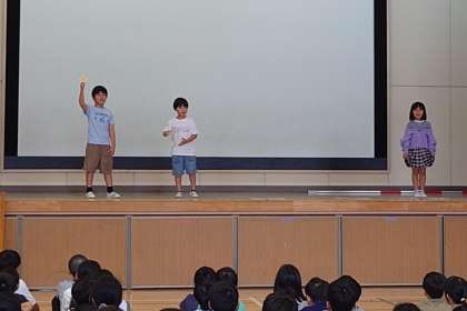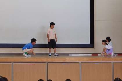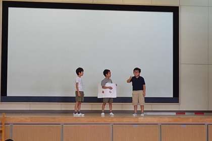 子どもまつりに先がけて、前日にCM集会が開かれました。各クラスが自分のお店の見どころを紹介するのですが、寸劇大会のようで毎年おもしろい仕上がりとなっております。