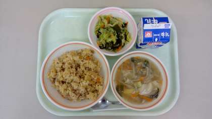 【今日の献立 10月23日(金)】 公開日 2020/10/23 更新日 2020/10/23 今日の給食 今日の献立は、キムチチャーハンでした。米の他に麦も入ってました。わかめサラダは野菜もたっぷり入っていました。ワンタンスープは熱々で、体がとても温まりました。