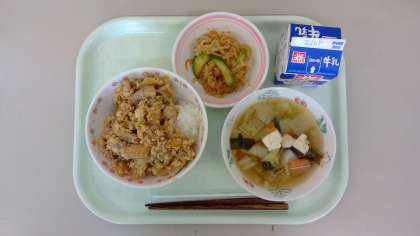 今日の献立は油揚げと卵、鶏肉、玉ねぎのたっぷり入った油玉丼が出ました。運動会の練習を頑張っている子供たち、とっても食欲があり、おかわりする姿が見られました。切り干し大根のごま酢和えは、さっぱりした味で、歯ごたえもありました。野菜たっぷりの汁も美味しくいただきました。