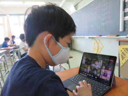 今回は、自宅にいる児童と学校にいる児童が、学級担任が開いたオンライン上の会議に参加する形式で行いました。今回は、これからの状況に備えて、改めてタブレット端末の操作や電波状況などをテストする機会にもなりました。子供たちは、離れた所にいる友達とオンラインでもつながれて喜んでいました。保護者の皆様、御協力ありがとうございました。