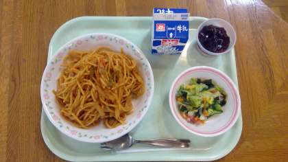 今日は梅雨の時期に咲くあじさいをイメージした「あじさいゼリー」です。透明な砂糖水のゼリーと紫色のぶどうゼリーの2層のゼリーで、ぶどうゼリーは、あじさいの花びらをイメージして角切りにしました。さっぱりしたゼリーは暑い日にぴったりで、子供たちは喜んで食べていました。