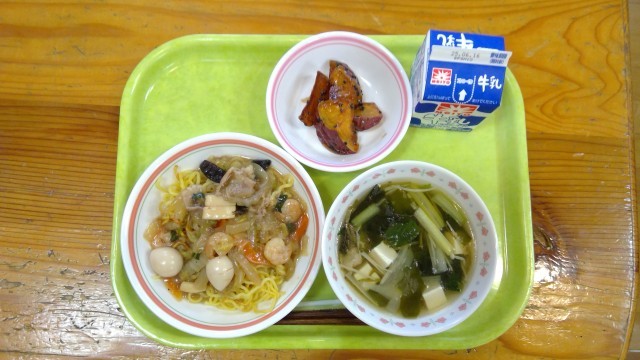 給食だより 6月10日(火) 公開日 2025/06/12 更新日 2025/06/12 今日の給食 今日の献立・あんかけ焼きそば・牛乳・海藻スープ・大学いも 今日は、「大学いも」の名前の由来について、食育メモでクラスにお知らせをしました。