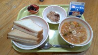 今日の献立・二色サンド・牛乳・グリルチキン・ミネストローネ・クランベリーミルクゼリー★今日は、手作りゼリーについて、食育メモでクラスにお知らせをしました。