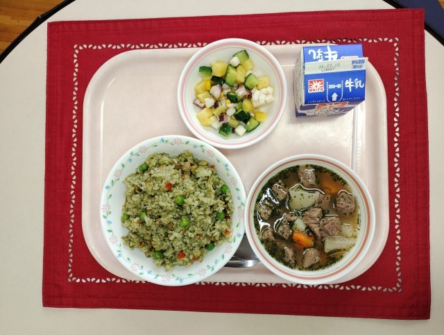 3/12(木) 公開日 2026/03/12 更新日 2026/03/12 給食関係 【ペルーコラボ給食】アロス コン ポーヨ(ペルー風チキンパエリア)セビーチェ(魚貝入りマリネ)サンコチャード(牛肉のポトフ)