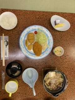 2日目 夕食 公開日 2021/10/16 更新日 2021/10/16 校長室より 牛すき鍋、豚ヒレカツ、メンチカツ、チキンナゲット、スパゲティーサラダ、生野菜:中華ソースかフレンチドレッシング、茶碗蒸し湯葉あんかけ、ご飯(栃木県産)、玉ねぎと大根の味噌汁、チョコケーキ、パイナップル