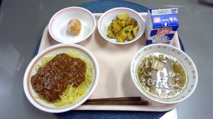 <お誕生日給食> ジャージャーめん もずくスープ お楽しみデザート (大学芋)