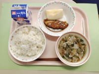 わかめごはんちぐさ焼きとり入りけんちん汁くだもの(りんご)