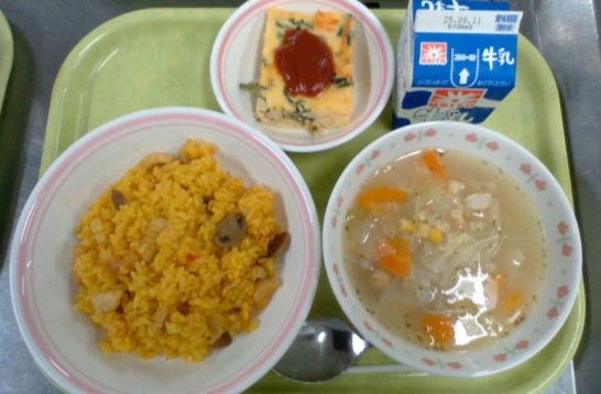 今日はスペインをイメージした給食を作りました。大西洋と地中海に面し、古くから様々な民族が行き交う場所にあったスペインでは地方によってさまざまな特色のある料理が作られてきました。今日はそんな中からスパイン語で「トルティージャ」と呼ばれるスペイン風のオムレツとおなじみのパエリアを作りました。普段混ぜご飯を苦手とする子もよく食べてくれていたように感じます。