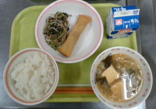 今日は食数が少なかったので、いつもはできない春巻きを作りました。春巻きは給食室で具を作ってから、春巻きの皮で丁寧に一つ一つ包んで、油で揚げてつくりました。とても大変な作業でしたが、子供たちは喜んで食べてくれていたのでよかったです。